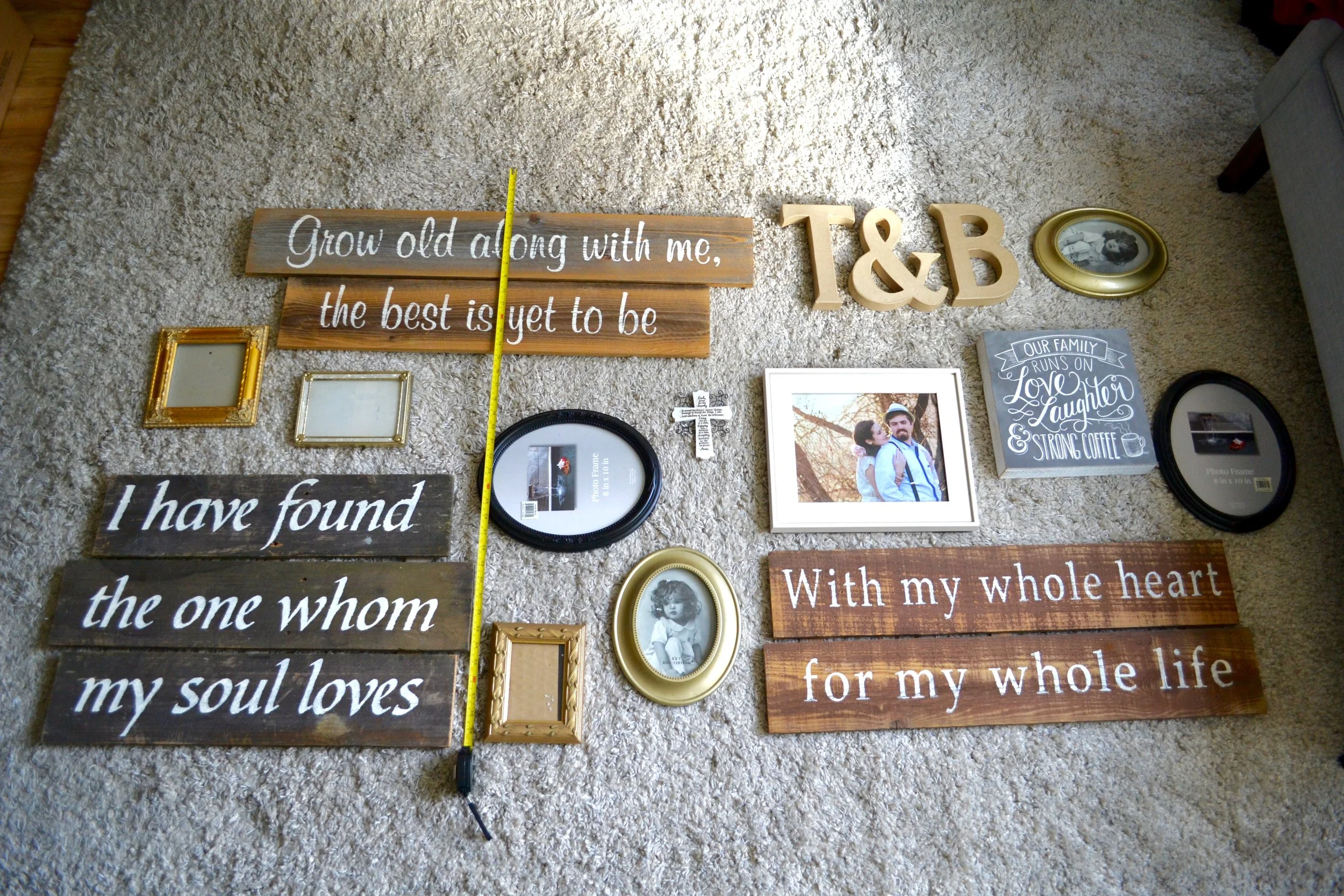 As you can see, however, this time around I was a little lazier and just laid out the frames and signs on the floor. I didn’t worry as much about width or height, but used the couch length as a loose guide as I was planning. Once I had it perfect and had all the pictures printed and in the frames, I solicited Tim’s help so I could double check the spacing as he was hanging. It turned out perfectly!