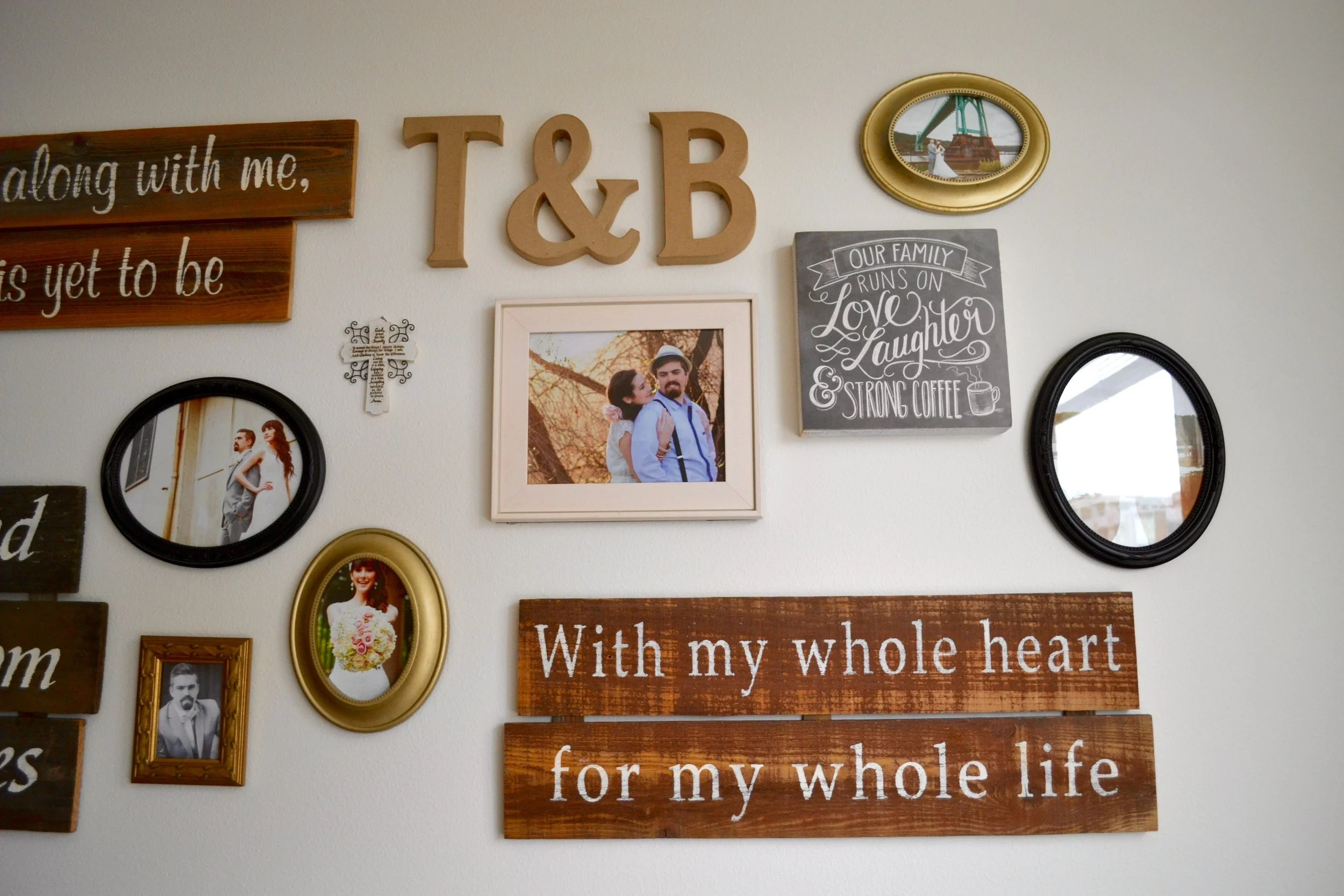 The wooden signs we hung were part of our wedding decor. Tim’s parents made about 8 of them for us and they were just too beautiful not to keep. I’m so beyond thrilled we finally have a few hanging up. We’re planning on hanging a few more in our bedroom, but that’s a different post for another day.